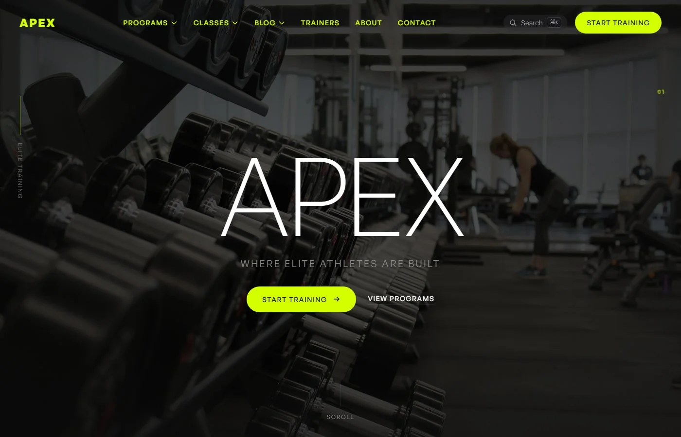 Apex Training es una plantilla premium de fitness y entrenamiento deportivo diseñada para gimnasios, entrenadores personales, coaches y centros de rendimiento deportivo. Doce páginas listas para producción cubren programas, entrenadores, clases, blog, about y contacto. Tres skins de color, animaciones GSAP en cada sección y una versión con Sanity CMS disponible para gestión completa de contenido sin tocar código.