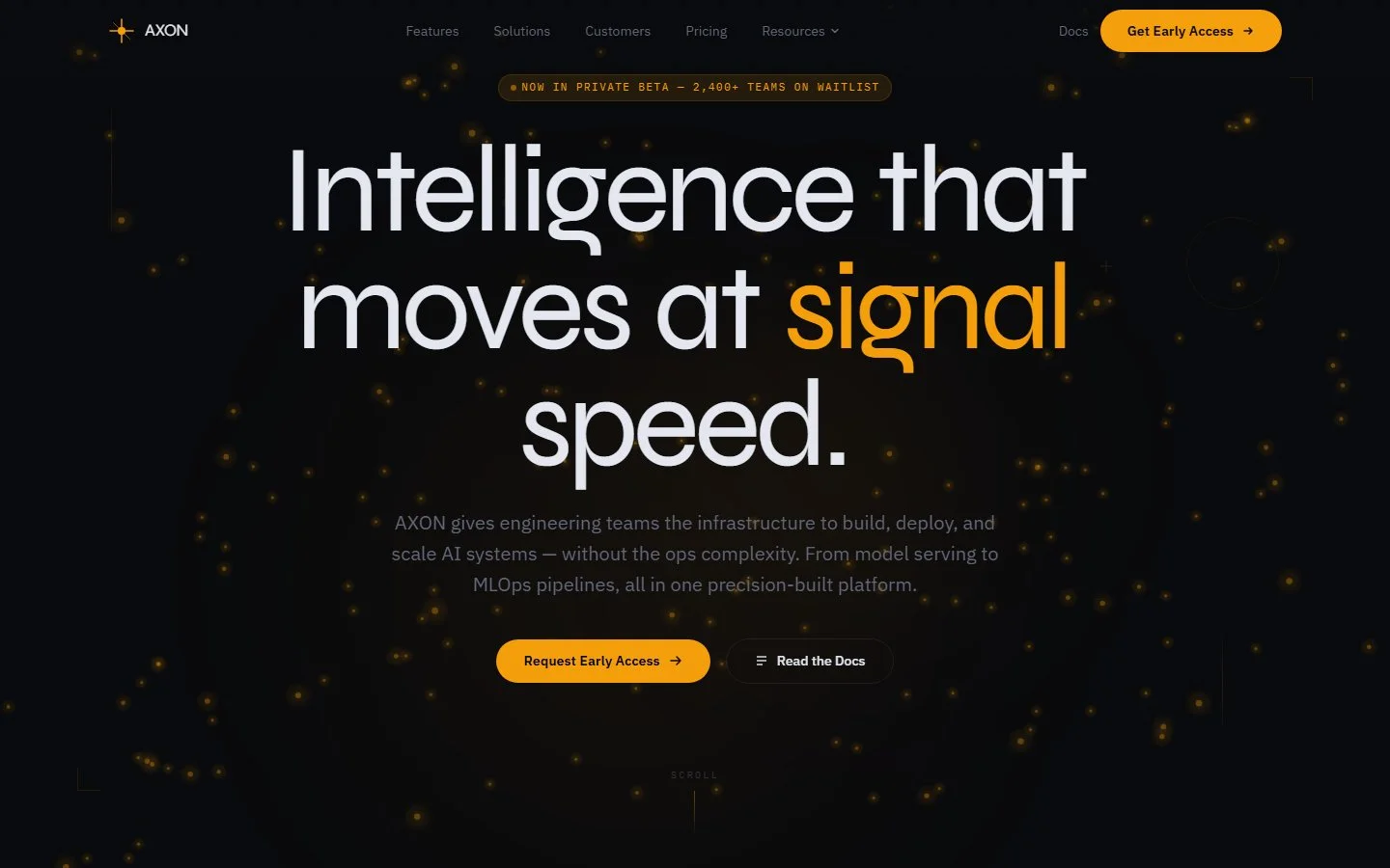 Axon es una plantilla premium de SaaS de infraestructura IA diseñada para plataformas ML, startups de IA y empresas de herramientas para desarrolladores. Trece páginas listas para producción cubren features, soluciones, precios, casos de estudio, blog, carreras, docs y contacto. Tres skins de color — Default ámbar, Glacier azul y Forge claro — intercambiables con un solo atributo HTML. Animación de red neuronal en canvas en el hero, cards con tilt 3D, botones magnéticos, efectos shimmer en bordes y animaciones GSAP de scroll en cada sección.