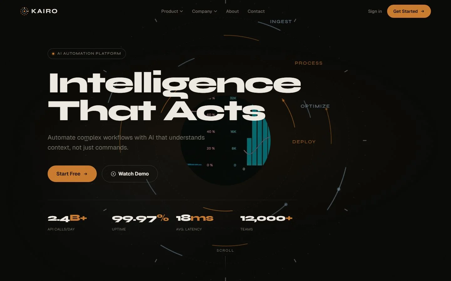 Kairo es una plantilla premium dark-cinema para SaaS diseñada para plataformas de IA, herramientas de automatización y productos para desarrolladores. Dieciocho páginas listas para producción cubren features, precios, integraciones, documentación, referencia API, changelog, blog, casos de estudio, carreras con postings individuales, about, contacto, status y páginas legales. Hero signature con cronómetro SVG animado y dashboard con iris-reveal, character scramble con GSAP SplitText, grilla bento de features, timeline con DrawSVG, specs técnicas sticky con terminal animada, y versión con Sanity CMS disponible por separado.